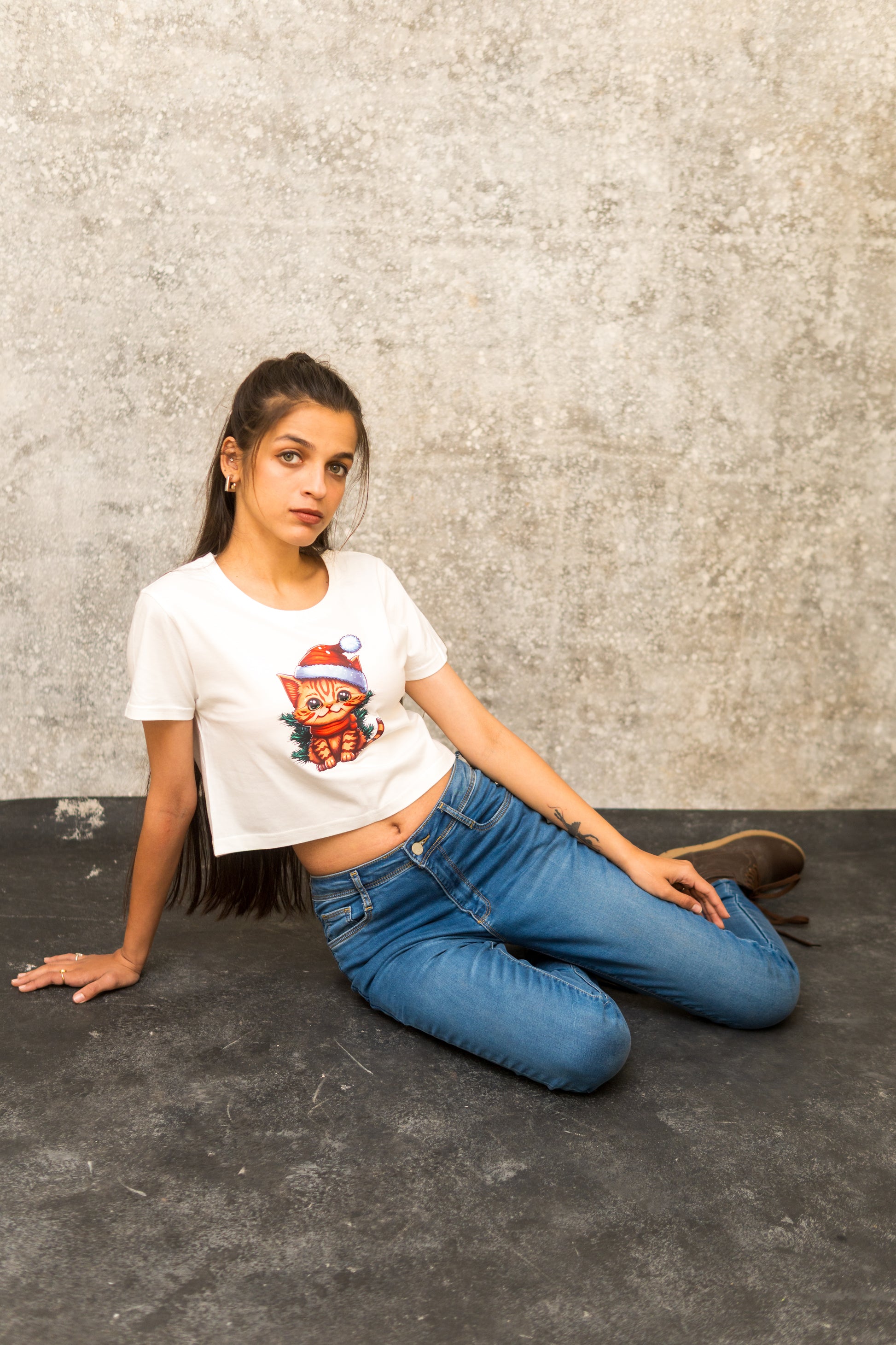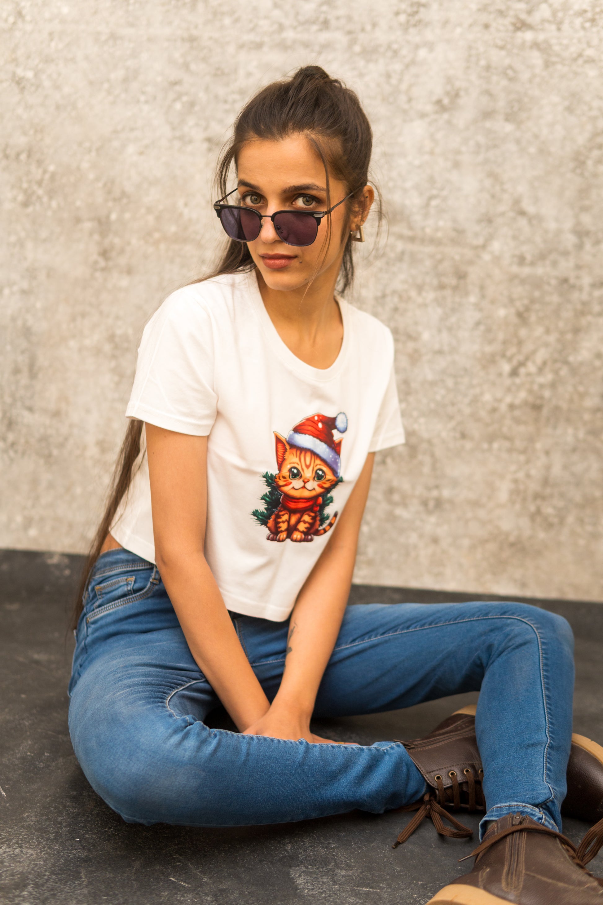 Festive, cute, and cosy — this white cotton crop top features an adorable Christmas kitten illustration wearing a Santa hat and scarf, perfect for holiday season vibes. Made from 100% pure cotton for a soft, breathable feel, the cropped silhouette and classic crew neckline make it a fun and comfy pick for winter gifting, parties, and everyday cheer.